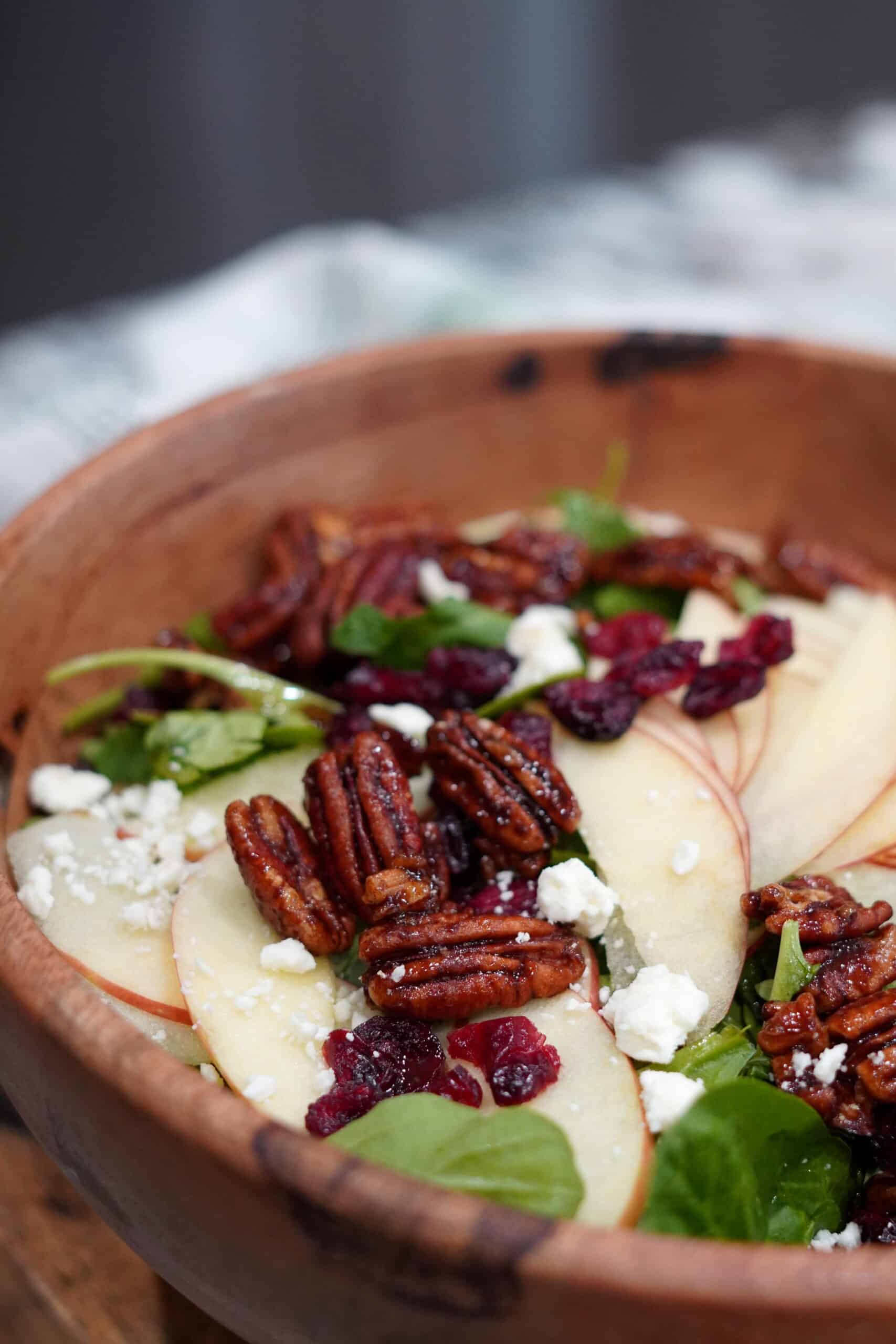 • Assemble the saladIn a large salad bowl, layer the mixed greens. Add the sliced apple, dried cranberries, pecans, and crumbled feta on top.