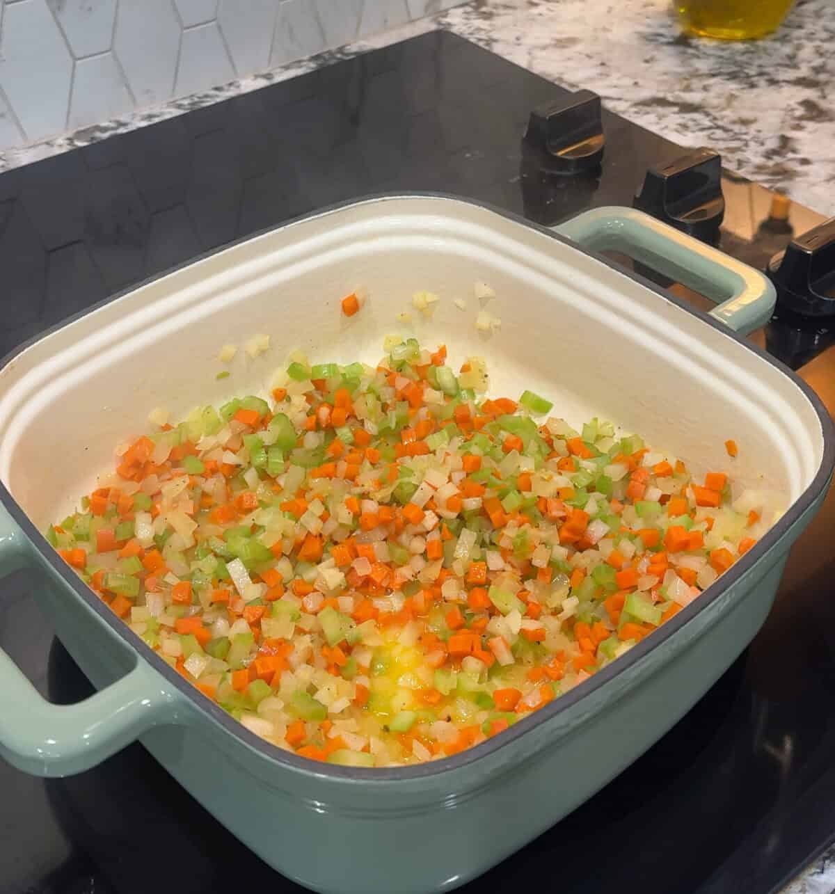 - Sauté the vegetables: In a large pot, heat olive oil over medium heat. Add the onion, carrots, and celery. Cook until softened, about 6–7 minutes. Stir in garlic, salt, pepper, Italian seasoning, oregano, and red pepper flakes