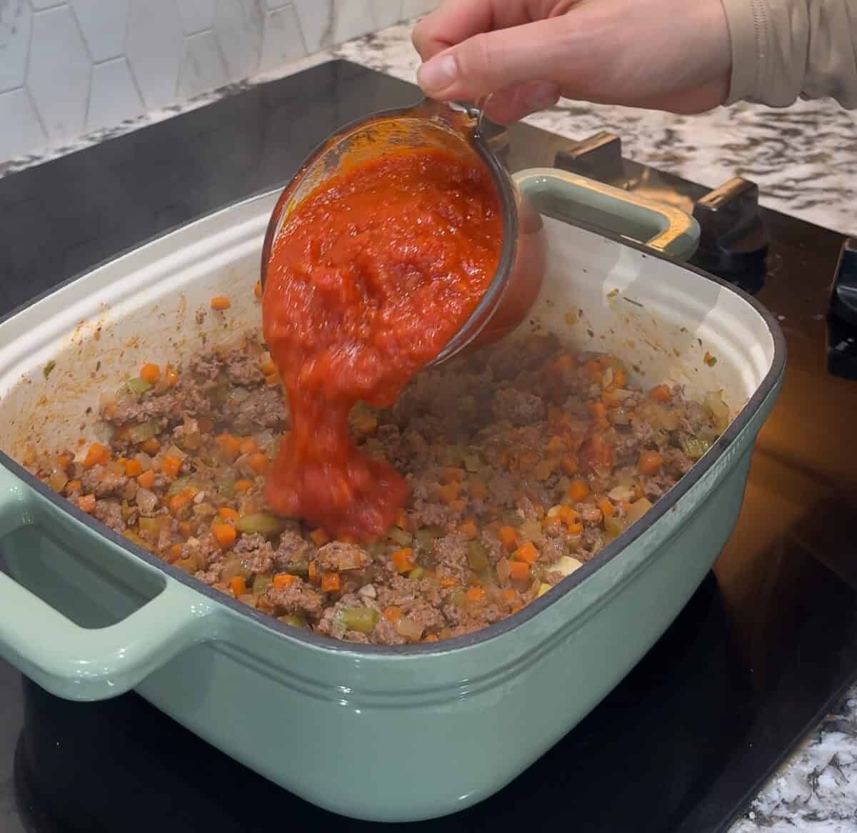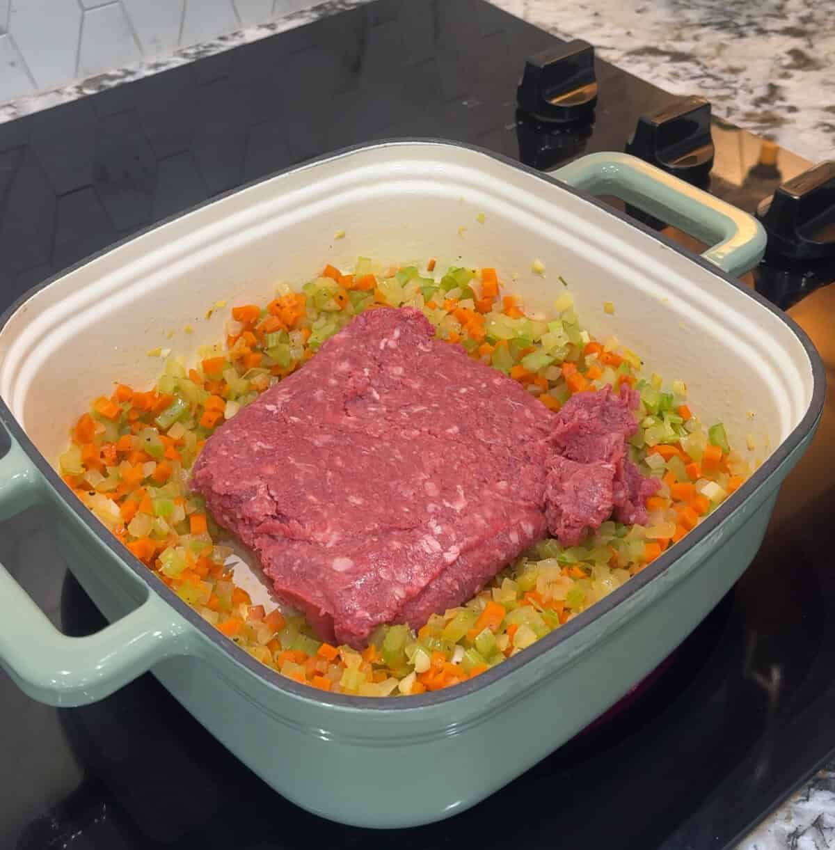 Sauté the vegetables :Heat oil in a pot, cook onion, carrots, and celery until soft (6–7 min). Add garlic, seasonings, and stir. Cook the beef: Add ground beef, season, and cook until browned. Drain fat if needed.