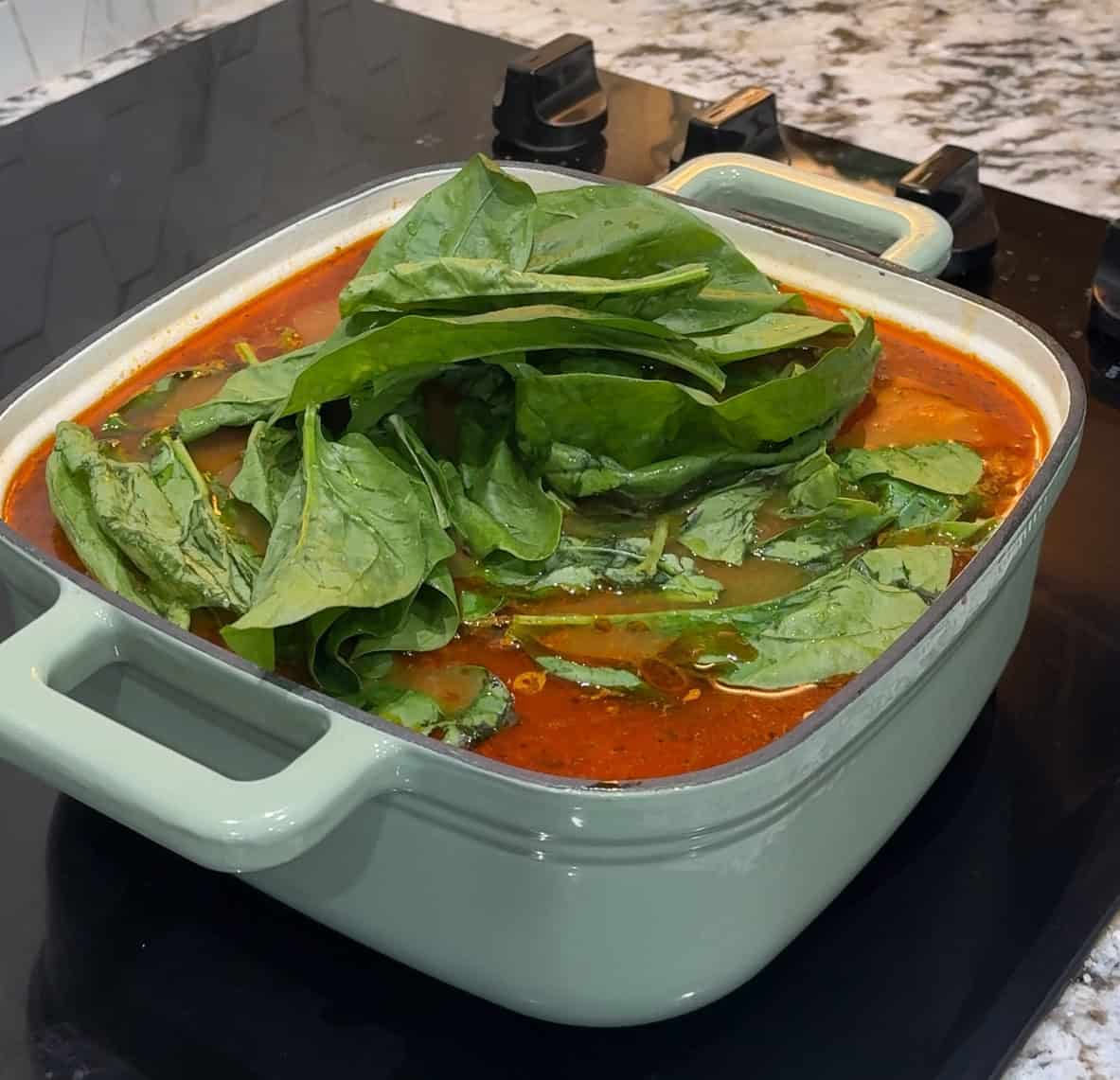 - Add pasta & spinach: Stir in the uncooked pasta and fresh spinach. Squeeze in the lemon juice. Cook uncovered until the pasta is tender, about 10 minutes.