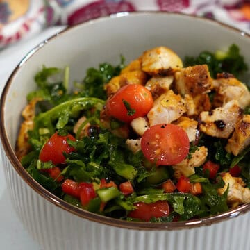 This hearty and healthy chicken salad is packed with fiber-rich kale and arugula, crisp veggies, seasoned chicken thighs, and a simple homemade vinaigrette. Perfect for meal prep or a fresh, satisfying lunch or dinner