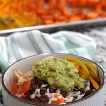 - Assemble: Divide roasted sweet potatoes between bowls. Top with seasoned beef, roasted veggies, shredded cheese, and a big scoop of guacamole.