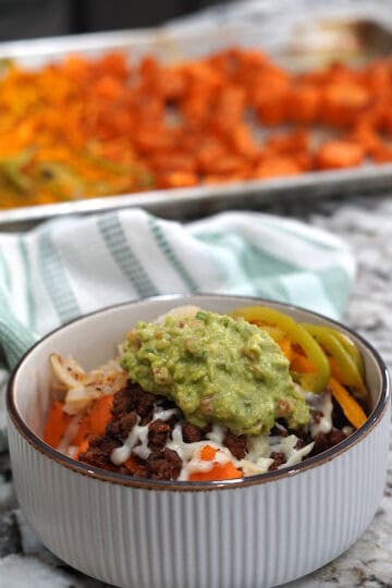 - Assemble: Divide roasted sweet potatoes between bowls. Top with seasoned beef, roasted veggies, shredded cheese, and a big scoop of guacamole.
